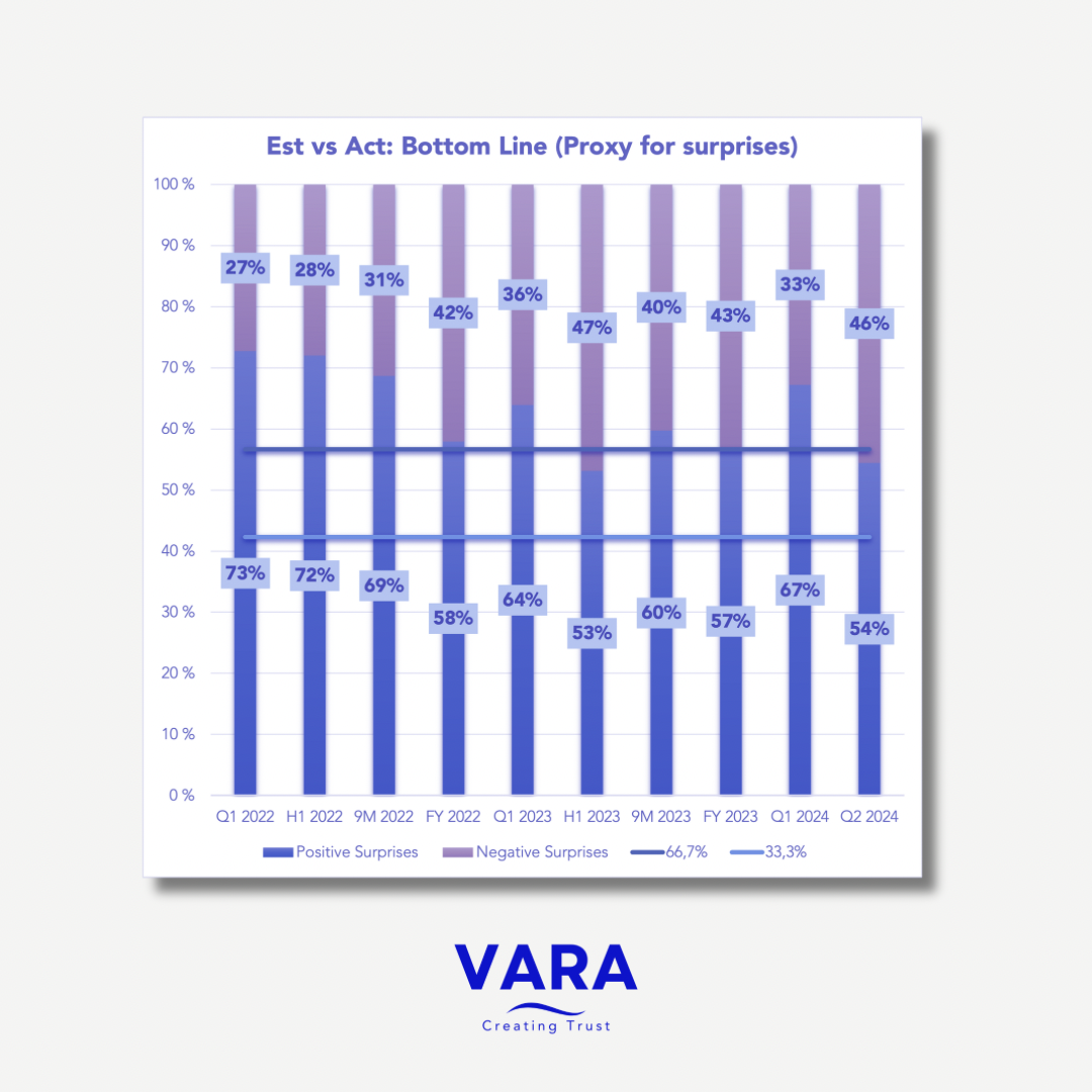 54% of companies beat the expectations, which is considerably lower than last time (67% in Q1, 2024). Looks like the margins have peaked.