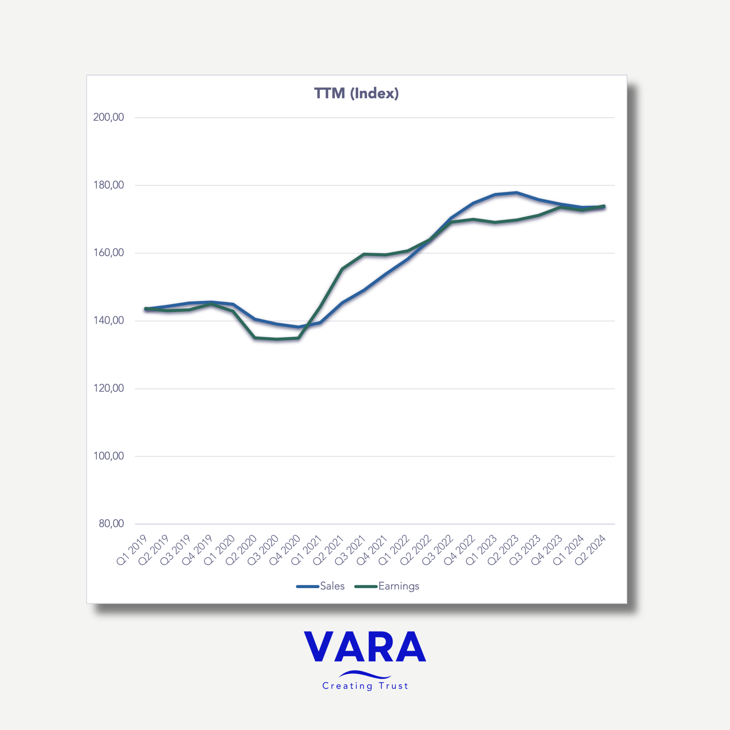 Earnings and sales growth looks to be in balance. Meaning that future earnings growth depends most likely on top line growth. Using VARA Pro investors should monitor how top line growth develops.