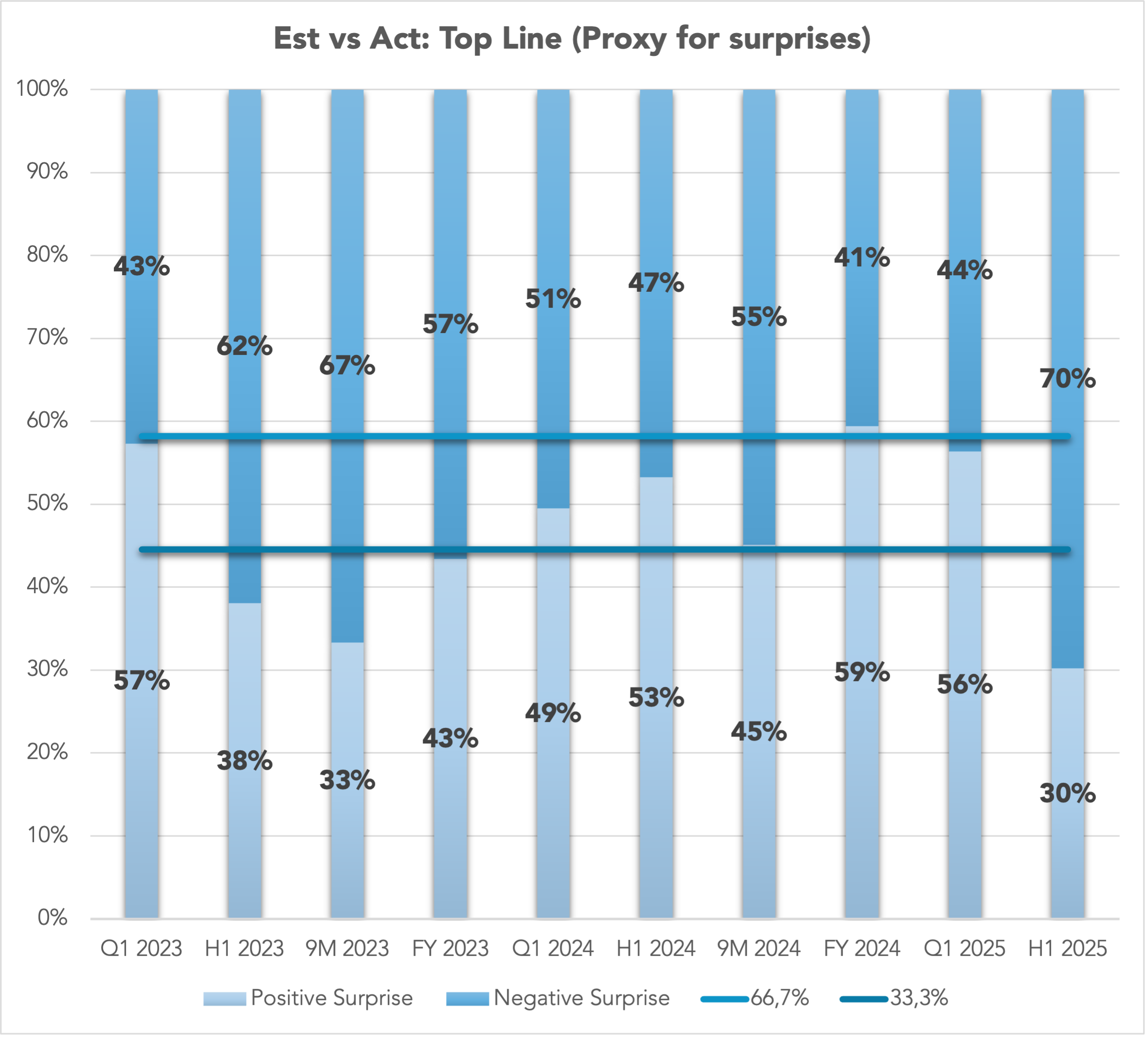 Companies are struggling to meet top-line expectations. After 56% exceeded sales estimates in Q1, only 30% managed to do so in Q2.