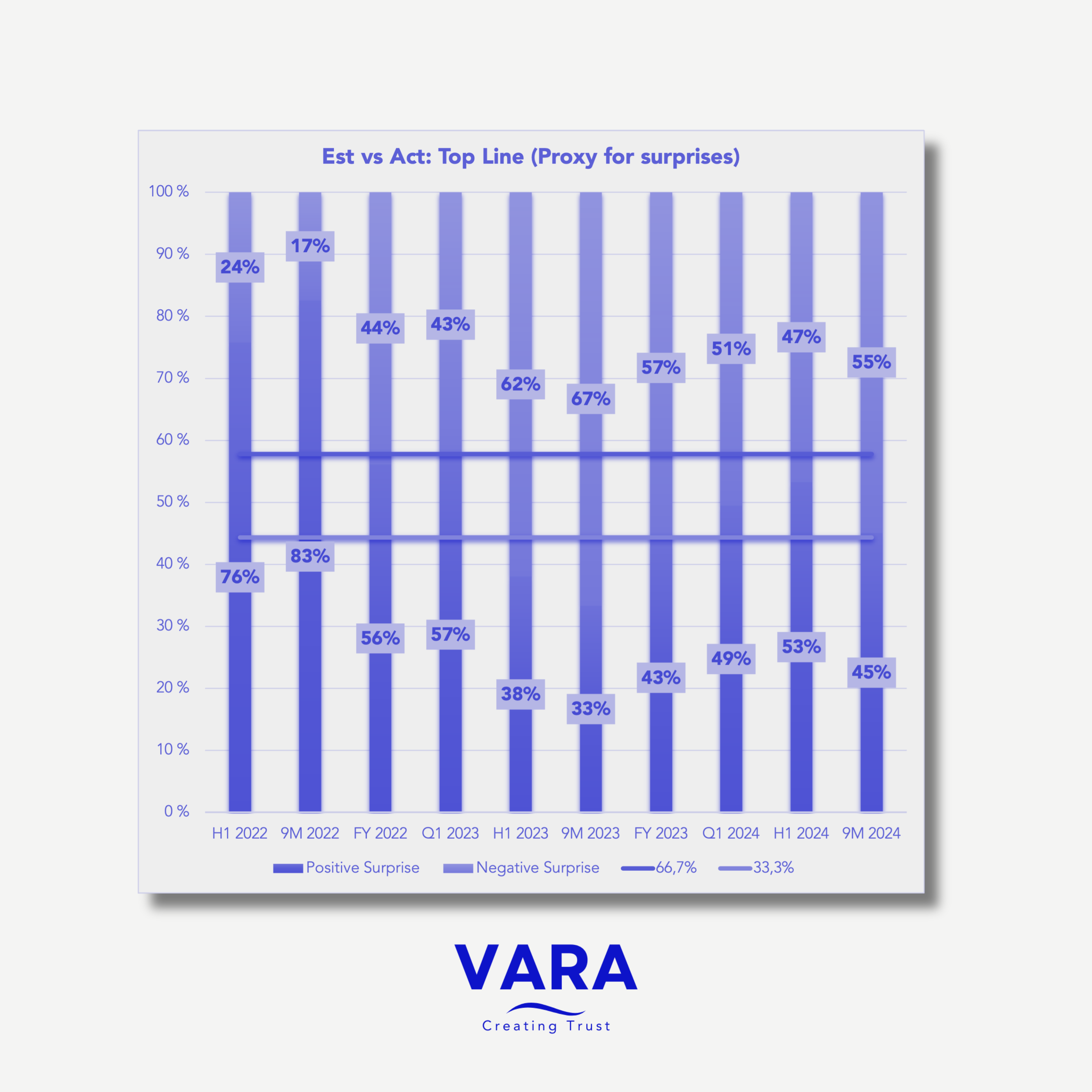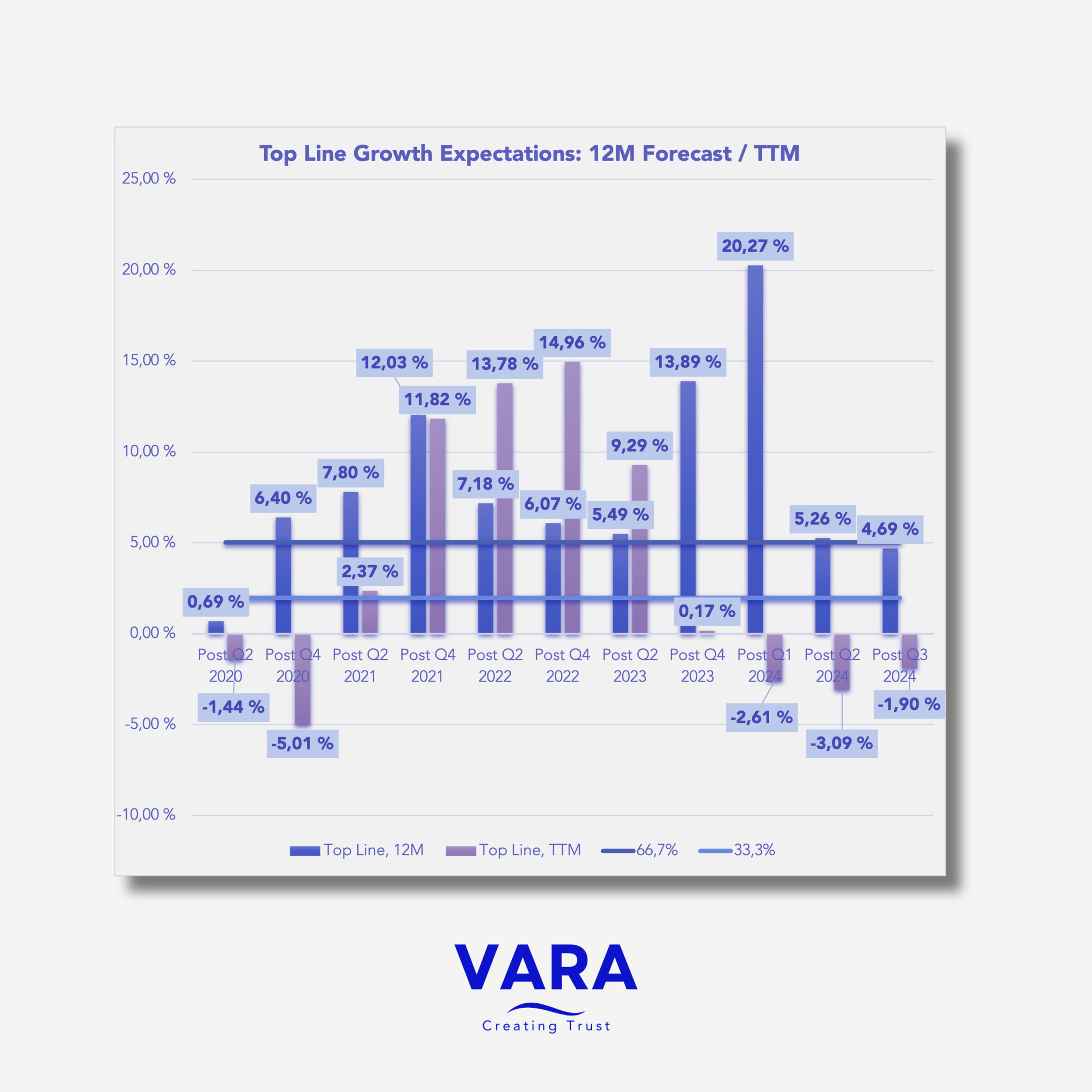 Despite the continued weak trend in top line growth, which is now in decline for the third consecutive period—often seen during crises—bottom line growth remains positive, although also low. Sales growth has been stagnant since the start of 2023, and while earnings and sales growth seem balanced, expectations have significantly dropped, from 41 to 10, indicating a shift towards more cautious outlooks.