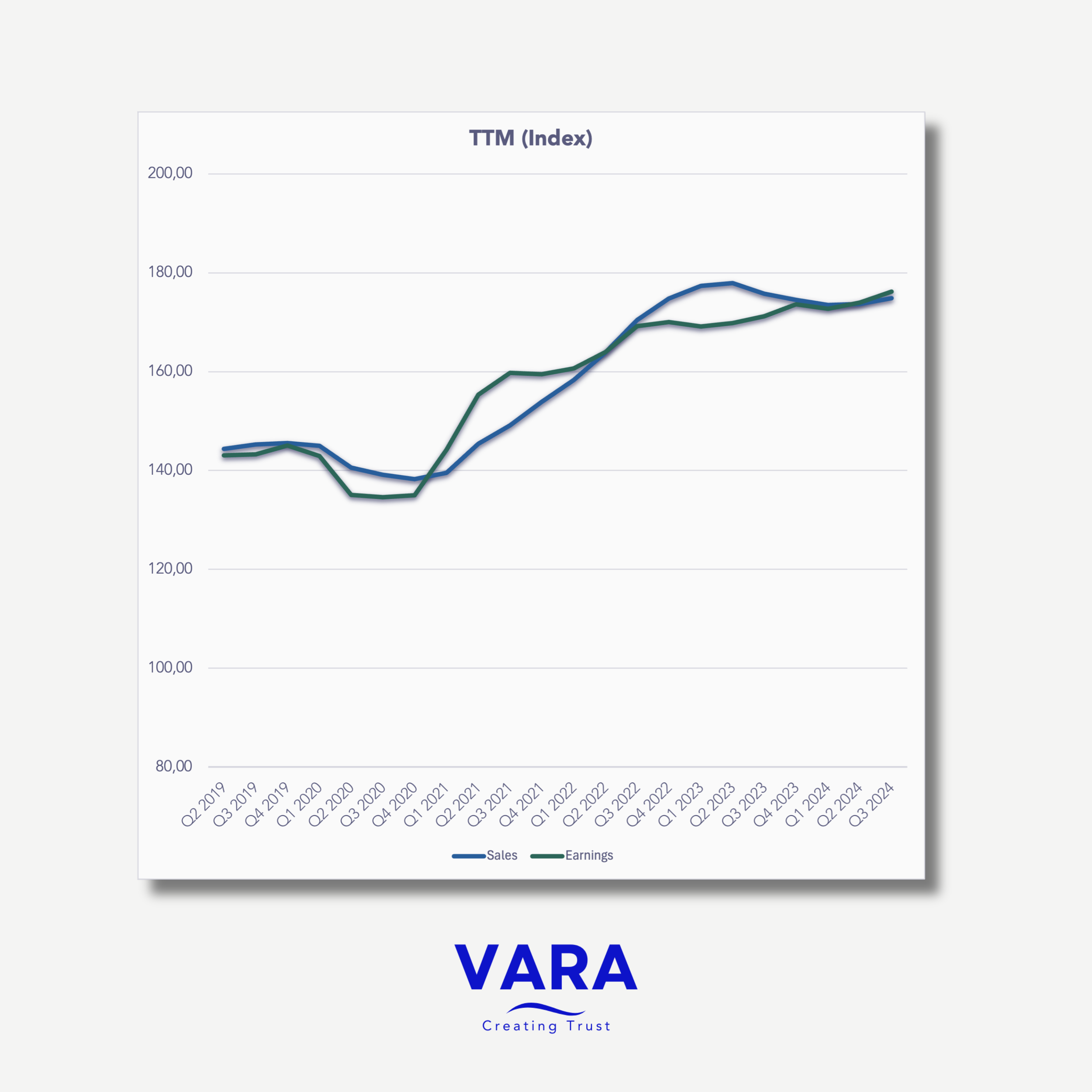 Earnings and sales growth appear to be in balance. However, sales growth has remained flat since the beginning of 2023.